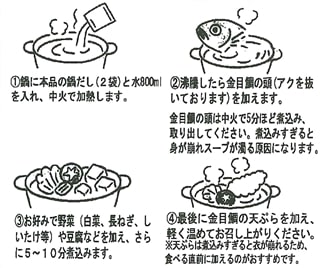 内容量 金目鯛天ぷら(180g)、金目鯛の頭(150g)、鍋つゆ(50g×2袋)